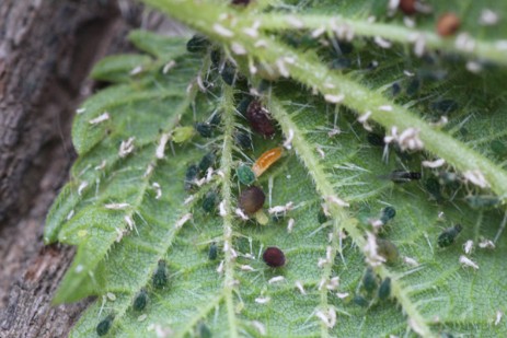 Gallmückenlarven (orange Farbe) fressen Blattläuse. Außerdem sieht man parasitierte Blattläuse, das sind die braunen Hüllen. Diese Blattläuse wurden von Schlupfwespen parasitiert, d. h. es wurde ein Ei in den Körper abgelegt, die heranwachsende neue Schlupfwespe ernährt sich von der Blattlaus und schlüpft dann aus der Hülle.